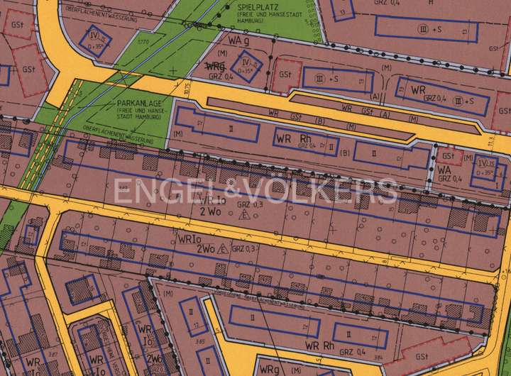 Nach dem gültigen Bebauungsplan Billstedt 90 I ist eine offene Bauweise mit einem Vollgeschoss zulässig. Darüber hinaus kann das Dachgeschoss ausgebaut werden, sofern es nicht als Vollgeschoss zählt und die geltende Geschossflächenzahl eingehalten wird. Die maximale Grundflächenzahl beträgt ca. 0,3. Das Baufenster liegt im nördlichen Teil des Grundstücks und umfasst ca. 12 m in der Breite sowie ca. 15 m in der Tiefe – verbunden mit einem großzügigen Südgarten. Damit bietet das Grundstück die Möglichkeit, entweder ein großzügiges Einfamilienhaus oder ein modernes Doppelhaus zu errichten.