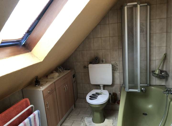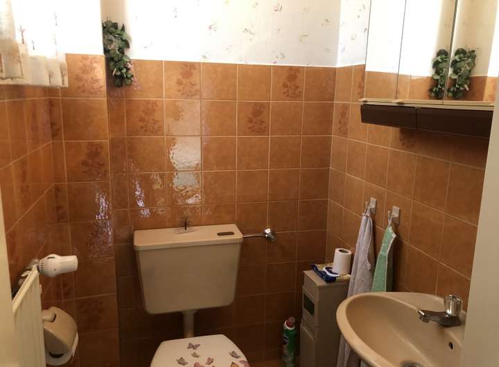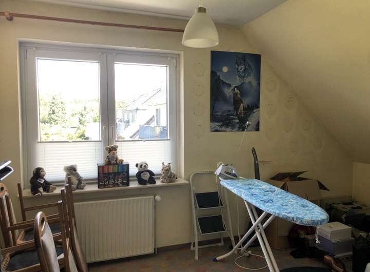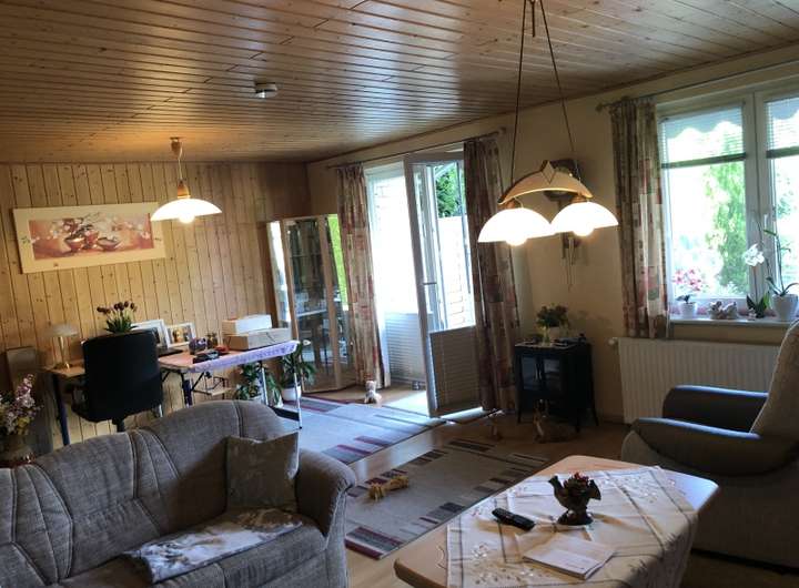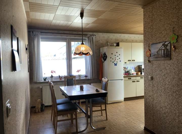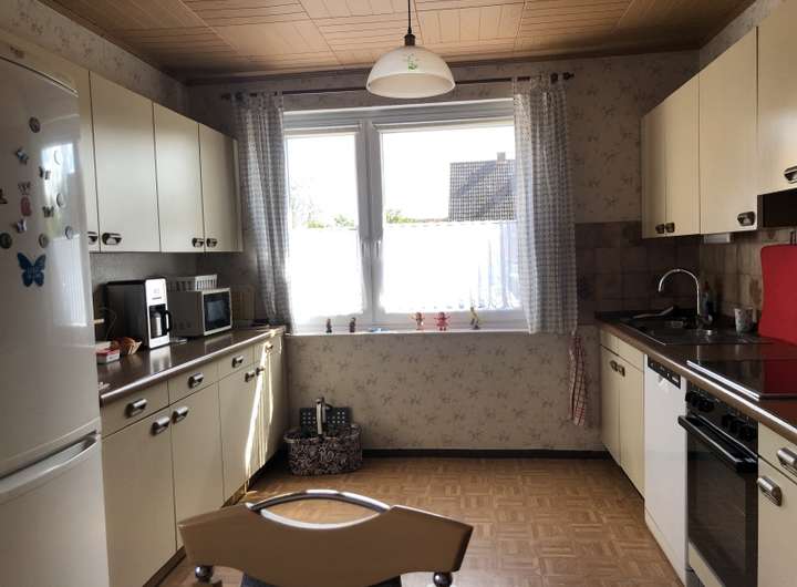 Erdgeschoss: Großes Wohnzimmer mit Zugang zur Terrasse und zum Garten, Wohnküche mit Einbauküche, Essdiele, Gäste-WC. Dachgeschoss: Schlafzimmer, Kinderzimmer I, Kinderzimmer II, Vollbad/WC. Vollkeller, zwei Garagen. Beheizung und Warmwassererzeugung erfolgen über eine Ölzentralheizung. Für den Öleinkauf ist der Mieter zuständig.