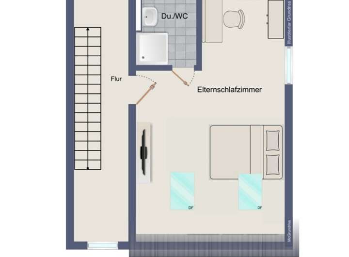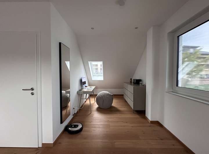 Im Dachgeschoss liegt das großzügige Elternschlafzimmer mit eigenem Duschbad und WC. Hier sorgt ein hochwertiger Eiche-Echtholzparkett und eine Deckenbeleuchtung mit modernen Downlights für eine warme und stilvolle Atmosphäre. Die Dachflächenfenster können mit elektrischen Außenjalousien beschattet werden.