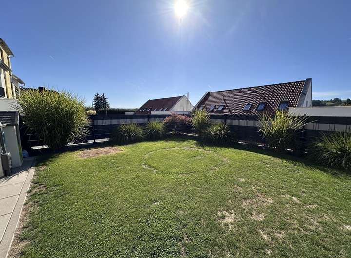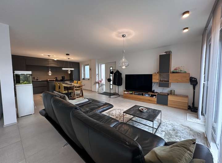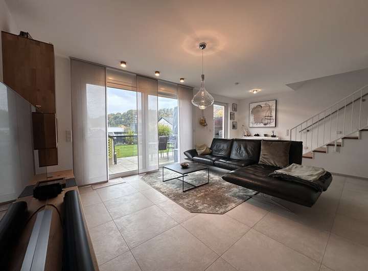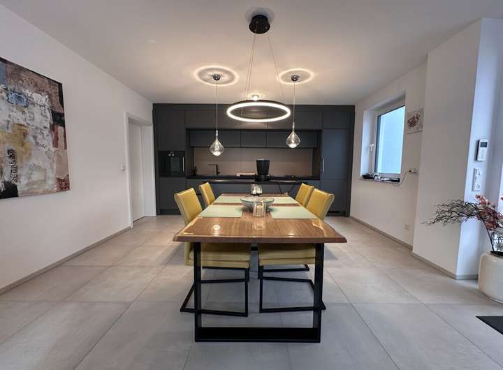 Im Erdgeschoss erwartet Sie ein offenes Wohn- und Esszimmer mit Küche, das durch großformatige Fliesen modern und pflegeleicht gestaltet ist. Große Fensterschiebetüren sorgen für viel Tageslicht und erlauben den direkten Zugang zum gepflegten Garten. Ein praktischer Abstellraum mit integrierter Wärmepumpe bietet zusätzlichen Stauraum und unterstützt das energieeffiziente Heizen der Immobilie.