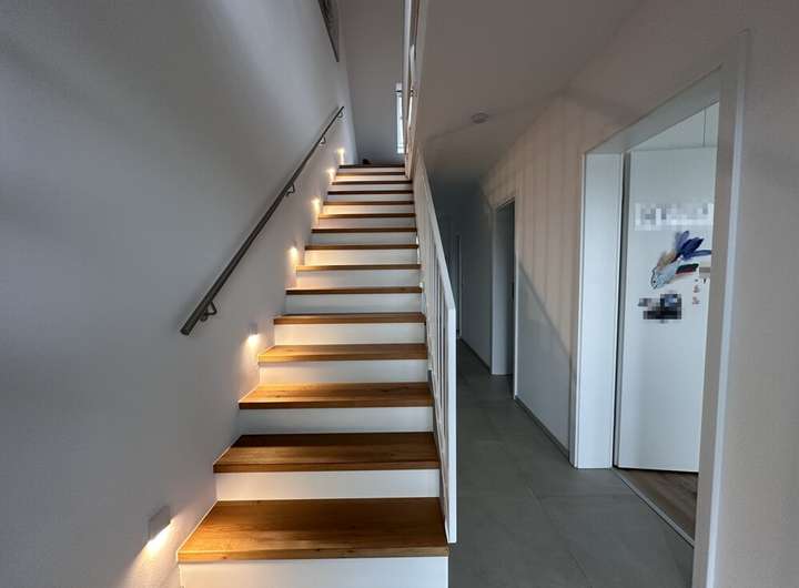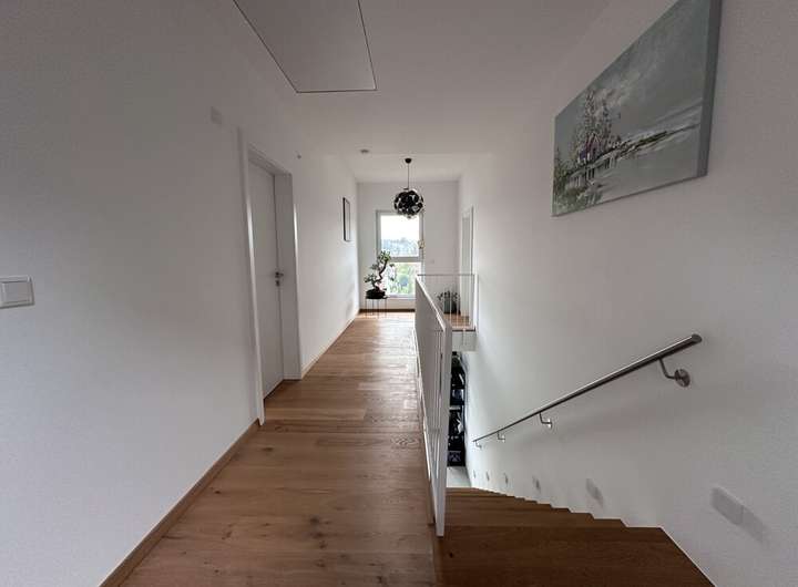 Über eine elegante, massive Treppe mit Echtholzbelag und Stufenleuchten gelangen Sie in das Obergeschoss, das mit edlen Großformatfliesen in Diele und Bad ausgestattet ist. Durch die 2-geschossige Bauweise finden Sie auf dieser Etage zwei helle Kinderzimmer mit guten Stellmöglichkeiten sowie ein modernes Badezimmer – perfekt für die Bedürfnisse einer Familie.
