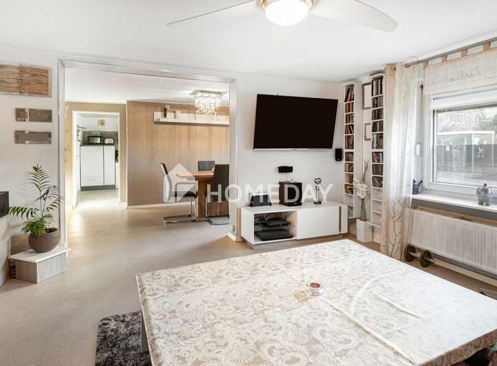 Die Erdgeschosswohnung verfügt über vier flexibel nutzbare Zimmer, eine Küche mit Einbauküche, zwei Badezimmer, zwei praktische Abstellräume, eine Gäste-Toilette und eine separate Waschküche – ideal für eine Familie oder auch als großzügige Einliegerwohnung.