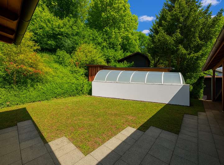 Das Raumkonzept besticht durch große, helle Zimmer, einen lichtdurchfluteten Wintergarten und ein stilvolles Kaminzimmer mit Marmordetails. Besonders hervorzuheben ist die großzügige uneinsehbare Dachterrasse mit Panoramablick sowie das Schwimmbad mit Gegenschwimmanlage. Der liebevoll angelegte Garten bietet reichlich Gestaltungspotenzial und lädt zum Entspannen ein.