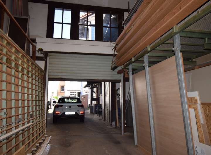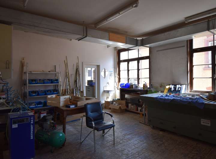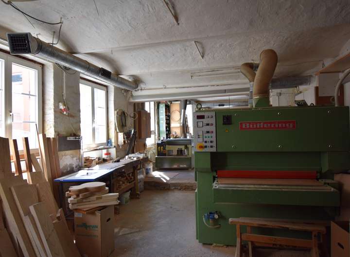 Die Gewerberäumlichkeiten, also die derzeitige Schreinerei, verteilt sich über zwei Ebenen und bietet Raum auf ca. 335 m².