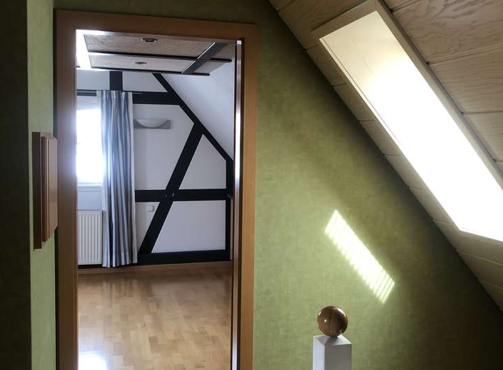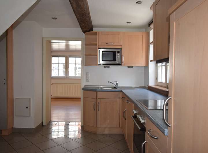 Einbauküche, Parkett, TGL-Duschbad, freiliegenden Deckenbalken, Lichterdecken.