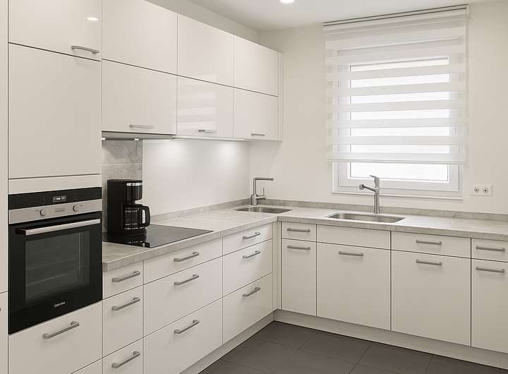 Im Kellergeschoss befindet sich eine stilvolle Einbauküche, ein modernes Duschbad sowie ein praktischer Hauswirtschafts- und Abstellraum mit maßgefertigten Einbauschränken.