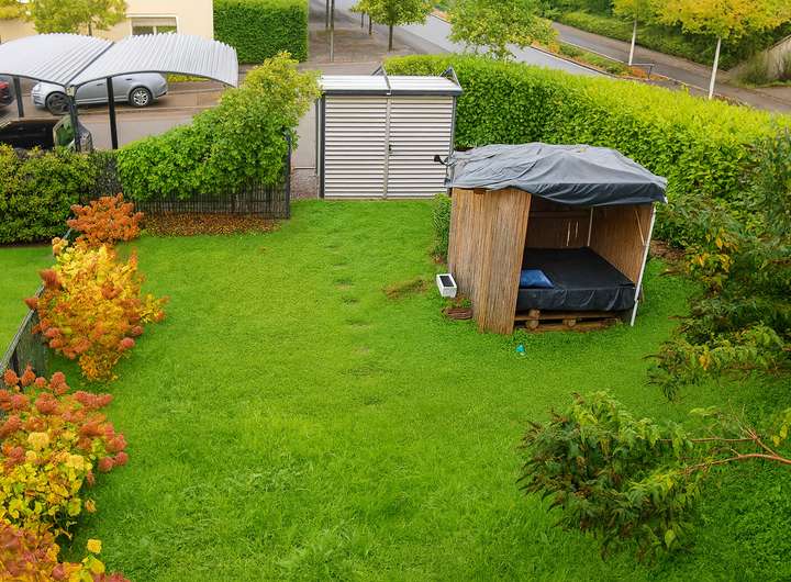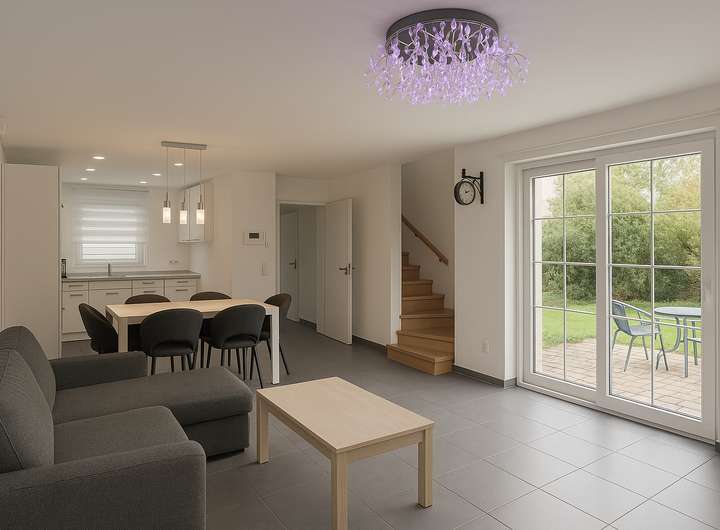 Das Erdgeschoss besticht durch ein großzügiges, lichtdurchflutetes Wohnzimmer mit direktem Zugang zum Garten und Pavillon. Eine moderne Einbauküche mit hochwertiger Ausstattung, ein Gäste-WC sowie eine Fußbodenheizung, die im gesamten Erdgeschoss verlegt ist, runden diesen Wohnbereich ab. Das Haus ist zudem teilweise möbliert und bietet sofort bezugsfertigen Komfort.