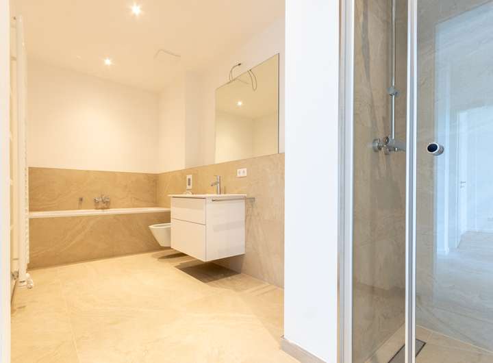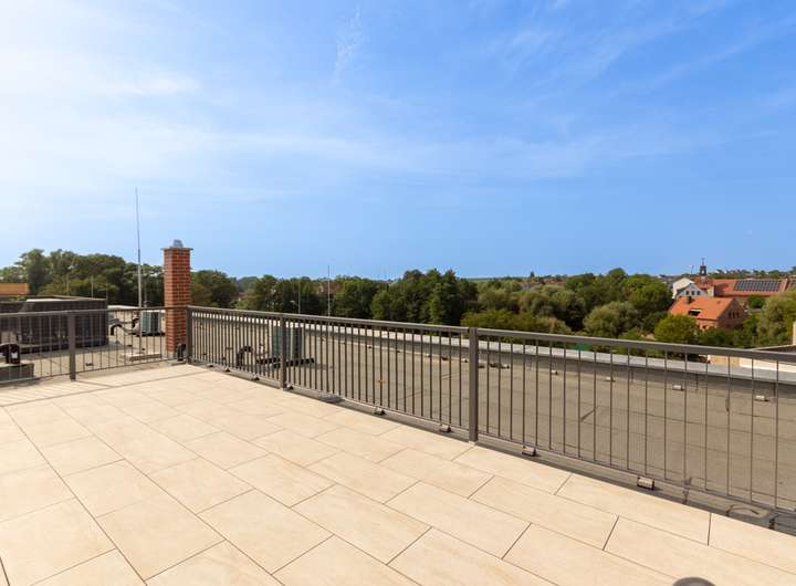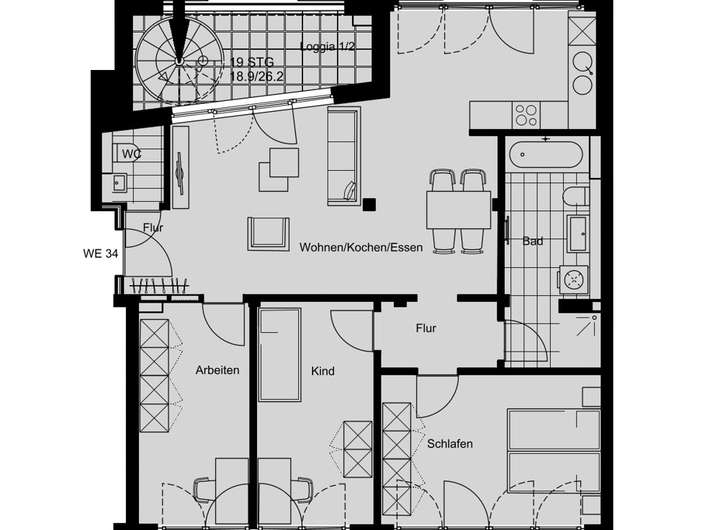 Diese moderne 4-Zimmer-Wohnung bietet auf ca. 128 m² eine durchdachte Grundrissgestaltung mit lichtdurchfluteten Räumen. Der großzügige Wohn-, Koch- und Essbereich bildet das Herzstück der Wohnung und verfügt über einen direkten Zugang zur Loggia. Von hier aus führt eine Treppe auf die rund 60 m² große Dachterrasse, die viel Platz zum Entspannen, Gärtnern oder geselligen Beisammensein bietet.