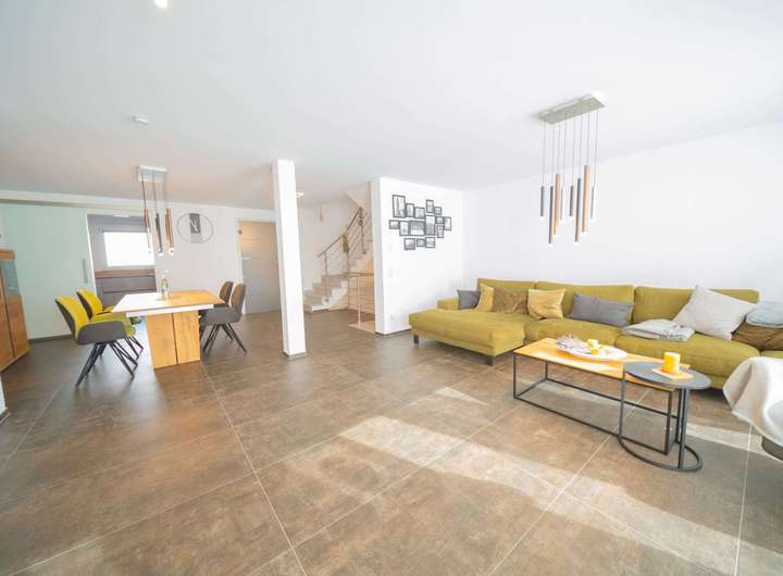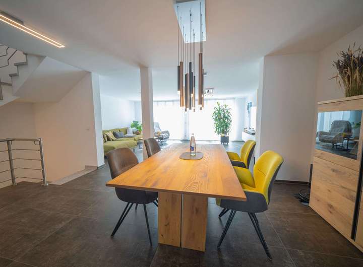 Auf rund 6,5 Zimmer verteilt, bietet das Haus ausreichend Platz für die ganze Familie. Der offen gestaltete Wohn- und Essbereich mit direktem Zugang zur großen Sonnenterrasse und dem gepflegten Garten bildet das Herzstück des Hauses – ideal für entspannte Stunden, Familienfeste oder gesellige Abende im Freien.