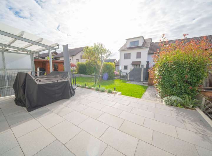 Die großzügige Terrasse lädt zum Entspannen und Grillen ein, während der gepflegte Garten als grüner Rückzugsort oder Spielbereich für Kinder dient – pflegeleicht, überschaubar und ideal für Menschen, die Komfort und Lebensqualität verbinden möchten.