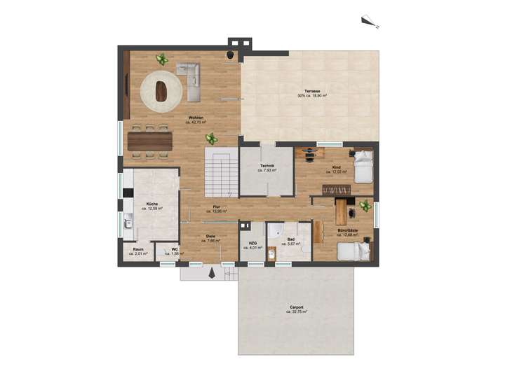 Der ganz private Bereich im Erdgeschoss überzeugt durch zwei helle Zimmer, ideal als Kinder-, Gäste- oder Arbeitszimmer, sowie ein Duschbad, das Funktionalität und Komfort perfekt vereint. Besonders praktisch: der Technikraum mit direktem Ausgang in den Garten, der alltägliche Abläufe wie Wäsche aufhängen oder Schuhe ausziehen besonders bequem macht.