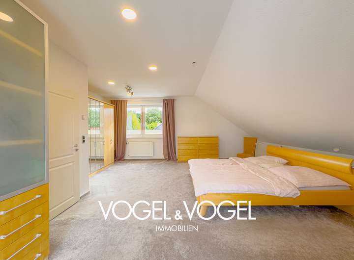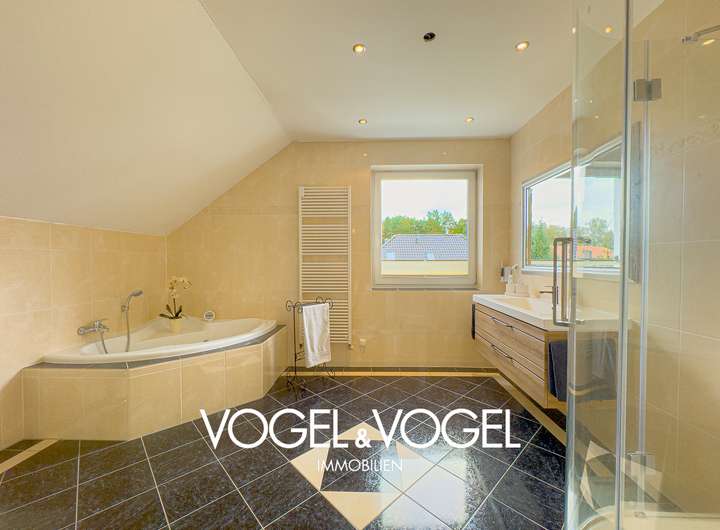 Im Obergeschoss erwarten Sie zwei überdurchschnittlich große Schlafzimmer: das Elternschlafzimmer als Rückzugsort mit Zugang zum Balkon, das Jugendzimmer mit riesigen Fensterfronten, viel Licht und ebenfalls Balkonzugang. Das luxuriöse Badezimmer begeistert mit Whirlpool, großzügiger Dusche, Fußbodenerwärmung und edlen italienischen Fliesen – Wellness pur zu Hause.
