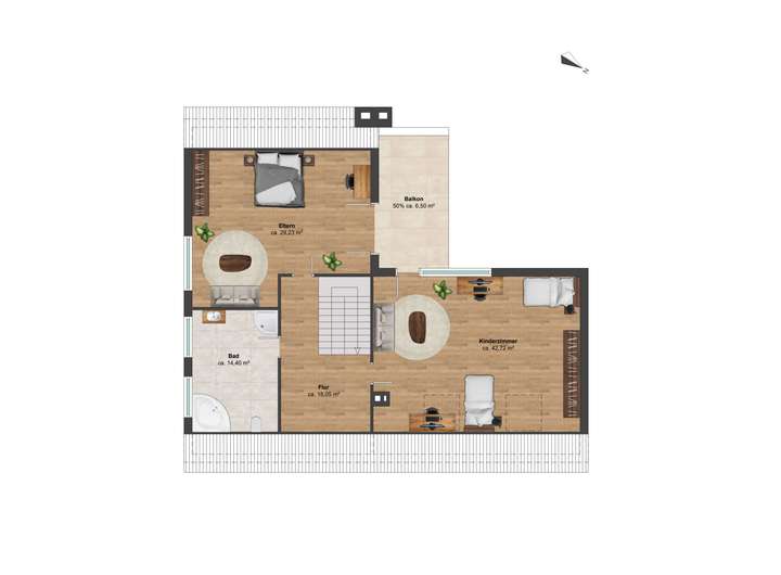 - Obergeschoss – Schlafzimmer: Eltern- und Jugendzimmer überdurchschnittlich groß, beide mit Balkonzugang