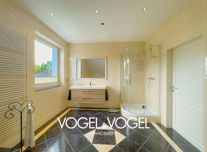 - Badezimmer Obergeschoss: Whirlpool, bodengleiche Dusche, Fußbodenerwärmung, edle italienische Fliesen