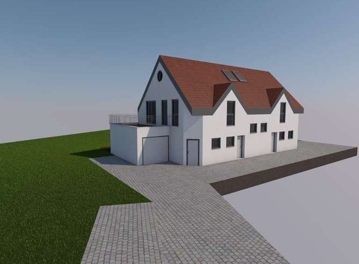 Für die Bebauung mit einem Doppelhaus liegt bereits ein durchdachtes Konzept vor: Die beiden Haushälften sind spiegelbildlich geplant, identisch in Größe und Aufteilung und verfügen jeweils über eine Gesamtwohnfläche von 129,68 m². Die Gestaltung auf drei Ebenen bietet großzügigen Raum für individuelle Wohnideen.