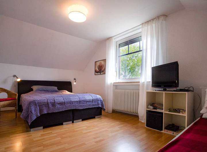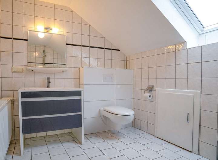 Im Dachgeschoss empfängt Sie ein großzügiger Flur, von dem aus Sie in das gemütliche Schlafzimmer, ein weiteres Wohnzimmer mit kleiner integrierter Küchenzeile sowie in ein helles Badezimmer mit Badewanne und Fenster gelangen. Das Dachgeschoss eignet sich perfekt als separater Gästebereich, Jugendtrakt oder für heranwachsende Kinder. Zusätzlichen Stauraum bieten die Schrägen.