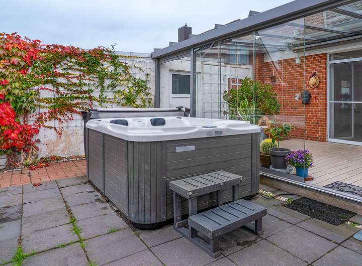 Der Garten ist liebevoll angelegt und bietet alles, was das Herz begehrt: einen Whirlpool, einen kleinen Teich, eine Gartenhütte und eine Terrasse zum Entspannen. Eine Garage steht ebenfalls zur Verfügung.