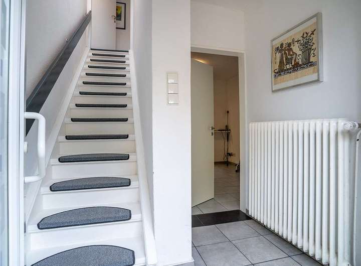 Beim Betreten des Hauses empfängt Sie ein kleiner Eingangsflur, von dem aus sowohl der Zugang ins Erdgeschoss als auch in das Dachgeschoss möglich ist, beide Bereiche sind durch Türen separat geschlossen und sorgen so für eine angenehme Raumtrennung und Privatsphäre.