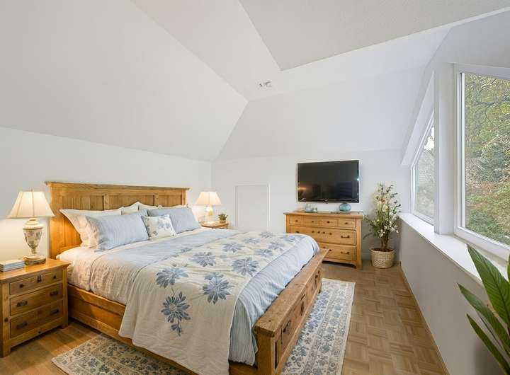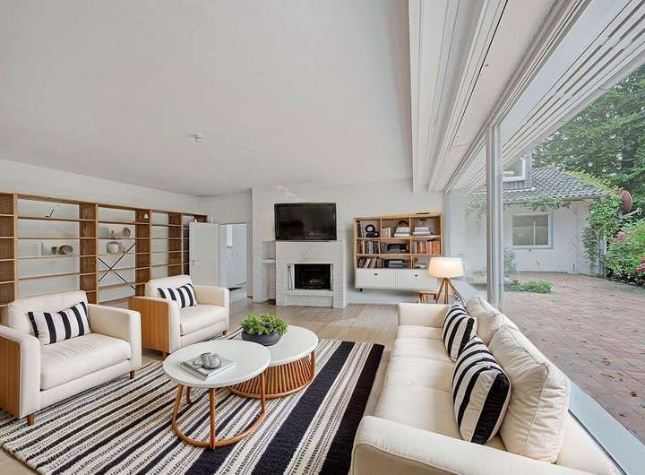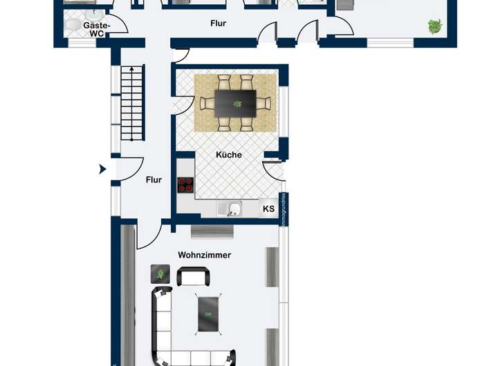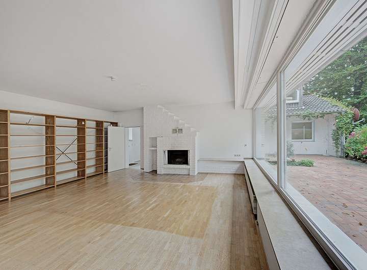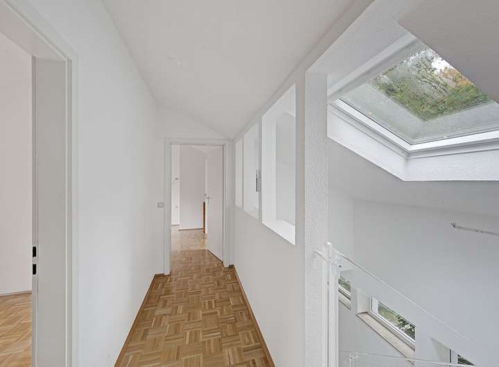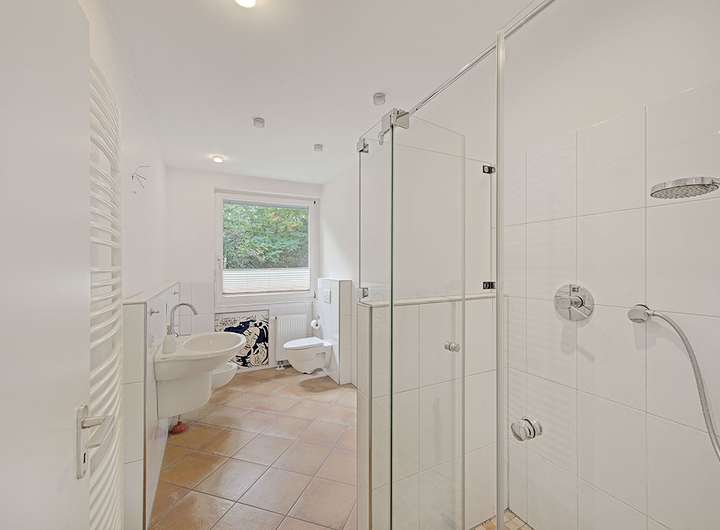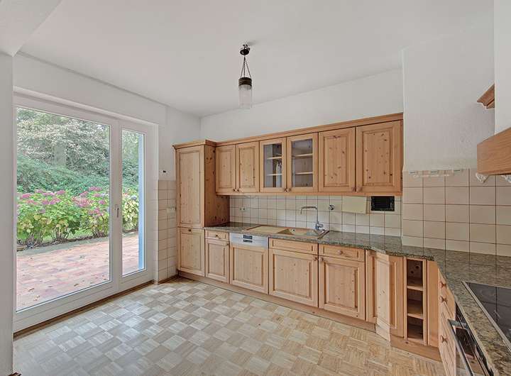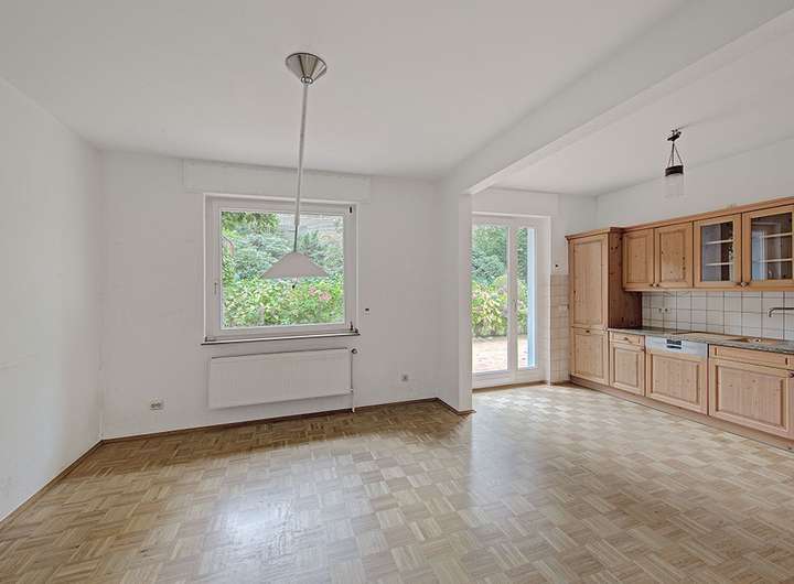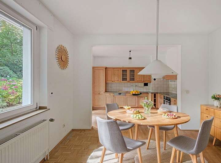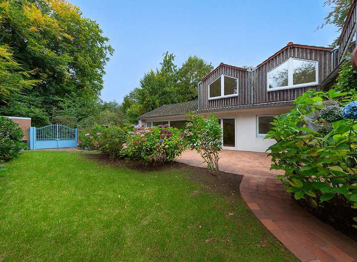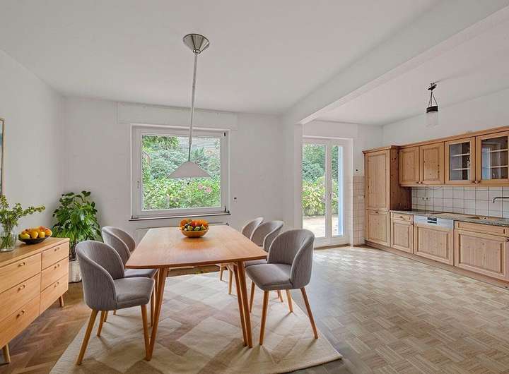 Bereits der Eingangsbereich vermittelt ein offenes Wohngefühl: Eine stilvolle, weiß gestrichene Treppe mit Plexiglas-Absturzsicherung führt elegant ins Dachgeschoss und eröffnet eine Galerie. Rechterhand befindet sich das großzügige Wohn- und Esszimmer mit Panoramaverglasung zum Garten, Zugang zur großen Terrasse sowie einem offenen Kamin. Die Küche ist separat angelegt, ebenfalls geräumig und mit direktem Terrassen- und Gartenzugang.