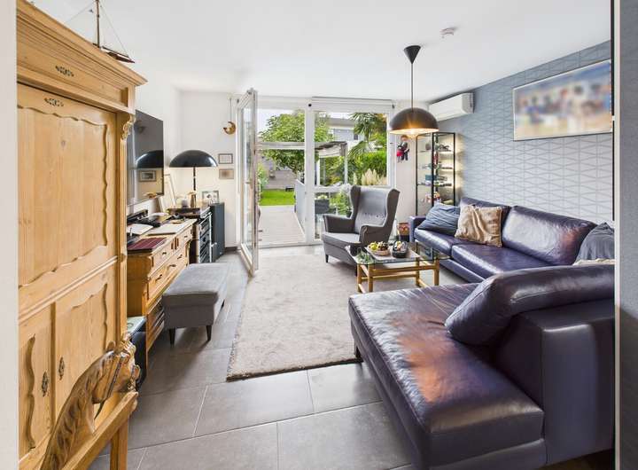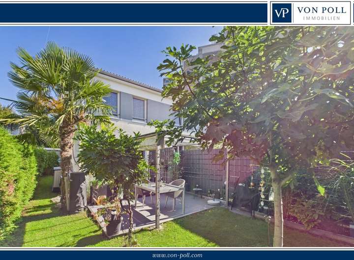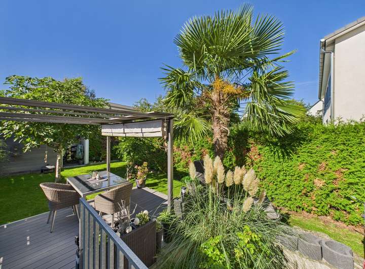 Ein echtes Highlight ist der gepflegte Garten, der durch eine dichte Hecke optimal vor Blicken geschützt ist. Eine automatische Bewässerungsanlage versorgt Pflanzen und Rasen zuverlässig mit Wasser, sodass die Pflege besonders komfortabel ist. Als Blickfang dient eine hochgewachsene Palme, die dem Garten mediterranes Flair verleiht. Die großzügige Terrasse lädt zum Entspannen ein und ist mit einem Sonnenverdeck ausgestattet, das auch an heißen Sommertagen angenehmen Schatten spendet. Ein kleiner Gartenschuppen bietet Platz für Fahrräder und Geräte, zusätzlich verbleibt ein praktischer Rasenmähroboter im Objekt. Über einen Zugang von der Rückseite ist das Grundstück ebenfalls bequem erreichbar.
