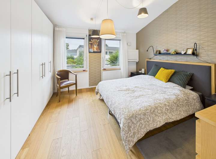 Im Obergeschoss befinden sich zwei helle Zimmer sowie ein modernes Tageslichtbad. Das Schlafzimmer ist zusätzlich mit einem Klimagerät ausgestattet, das auch in den Sommermonaten für angenehme Temperaturen sorgt. Hohe Decken und edler Parkettboden schaffen hier eine besondere Wohnatmosphäre.