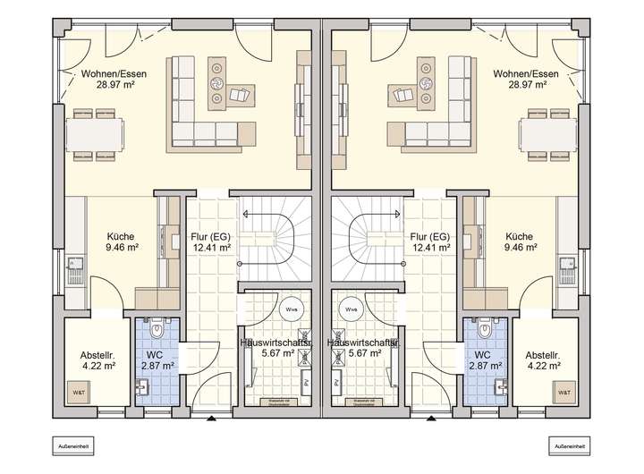 Was dieses Projekt besonders macht? Die Kostenersparnis, die Sie durch die Teilung der Baunebenkosten und Erdarbeiten erzielen – so können Sie sich Ihren Traum vom Eigenheim zu einem noch besseren Preis-Leistungs-Verhältnis erfüllen. Besonders attraktiv wird es durch die Energieeffizienz und Nachhaltigkeit: Jede Haushälfte ist mit einer eigenen Photovoltaikanlage inklusive Speichermedium ausgestattet, was Sie nicht nur unabhängiger von externen Energiekosten macht, sondern auch die Umwelt schont. Hinzu kommt eine Wärmepumpe mit Kühlfunktion, die für angenehme Temperaturen zu jeder Jahreszeit sorgt – effizient und umweltfreundlich.