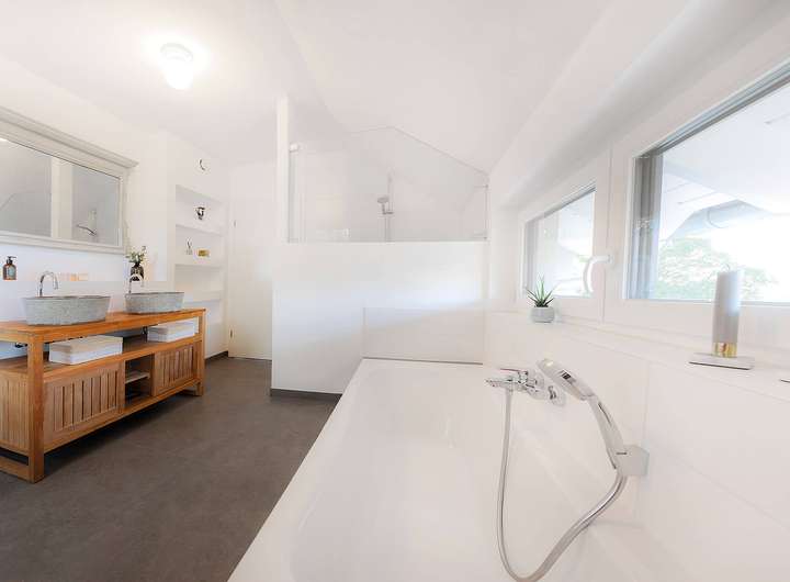 Die keilgezinkte Buche-Treppe führt ins Obergeschoss, das mit drei vielseitig nutzbaren Zimmern aufwartet. Ob als Schlafzimmer, Gästezimmer, Kinderzimmer oder Büro – hier haben Sie alle Möglichkeiten, Ihre Ideen zu verwirklichen und sich Ihre ganz persönliche Wohlfühl-Oase zu schaffen.