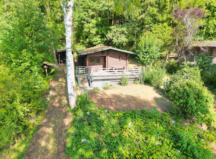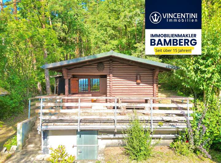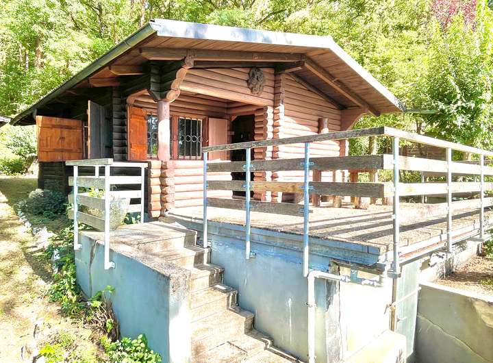 Herzstück des Grundstücks ist eine in den frühen 1970er Jahren errichtete, massive Blockhütte. Die charmante Holzhütte mit Fensterläden bietet zwei Räume: