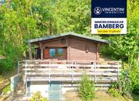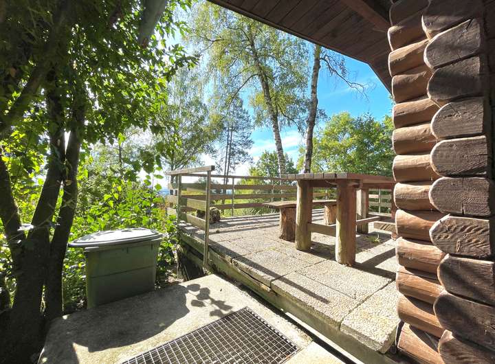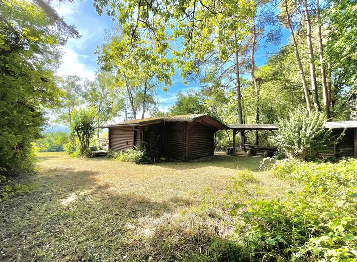 Bebauung: Massive Blockhütte (Anfang der 1970er, ohne Baugenehmigung errichtet) mit Terrasse, Keller, Nebenhaus mit Freisitz, Geräteraum und Toilette