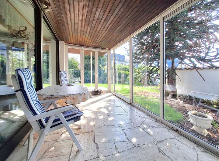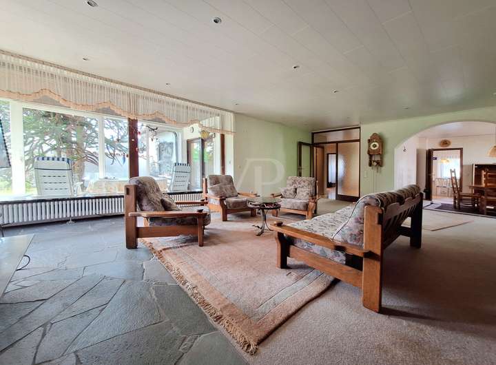 Ein großzügiges Entree mit Einbauschränken für die Garderobe führt Sie in den ca. 50 Quadratmeter großen Wohn/Essbereich mit Wintergarten und Zugang zur Gartenterrasse. Ein gemütlicher Kaminofen schafft eine warme Atmosphäre für gemeinsame Stunden mit Familie und Freunden.