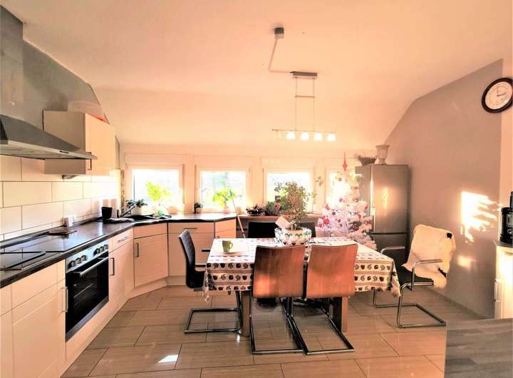 Die 100 m² Wohnung im Obergeschoss hat eine große, schicke Wohnküche mit Einbauküche, 2 Schlafzimmer, 1 Bad und 1 Wohnzimmer mit Zugang auf die große Dachterrasse.