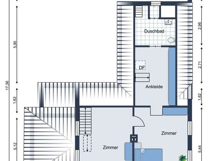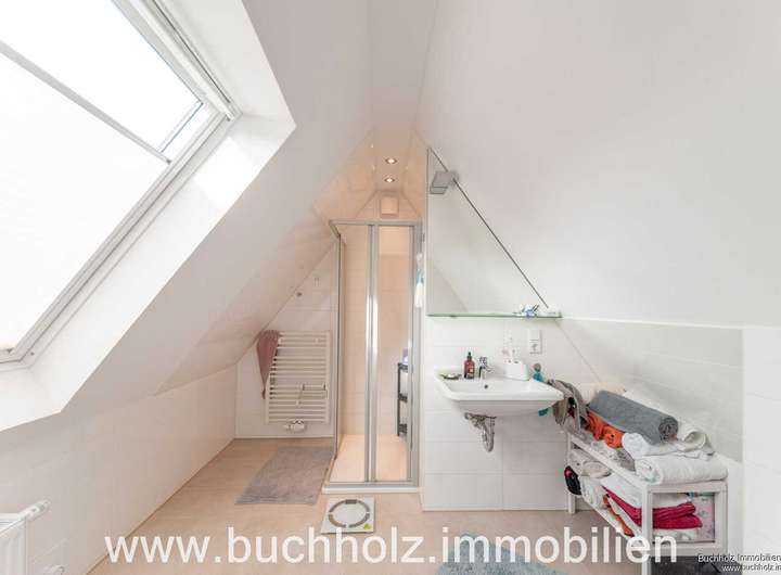 Im Dachgeschoss erleben Sie durch Schrägen ein gemütliches Raumgefühl. Zwei Zimmer können hier genutzt werden, und über wenige Treppenstufen durch einen Ankleidebereich zeigt sich das angrenzende Duschbad mit Fenster.