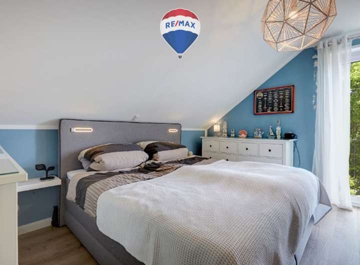 Die Ausstattung des Hauses ist durchweg hochwertig und stilvoll: Marmoroptik-Fliesen aus Feinsteinzeug im Erdgeschoss und Design-Vinyl in Holzoptik im Obergeschoss treffen auf Innenputz in Q3-Qualität mit Malervlies. Bodentiefe Fenster mit abschließbaren Markengriffen, französische Balkone in pulverbeschichtetem Anthrazit sowie Velux-Dachfenster mit Klapp-Schwing-Funktion, Thermo-Schallschutzverglasung, Solarrollladen und Insektenschutz sorgen für ein helles und ruhiges Wohnambiente. Die Doppelflügeltür im Landhausstil verbindet den offenen Wohn- und Essbereich harmonisch miteinander. Im Eingangsbereich wurden eingelassene Schuhabstreiferwannen integriert – ein durchdachtes Detail, das den Alltag erleichtert.