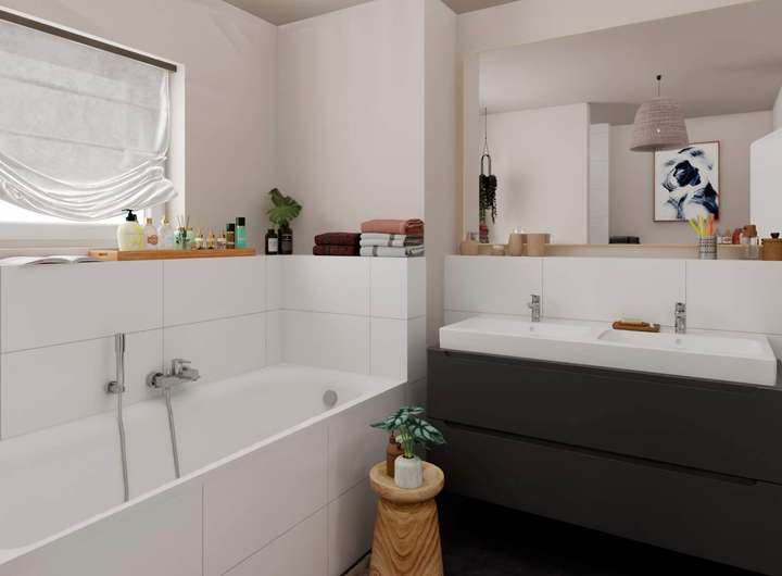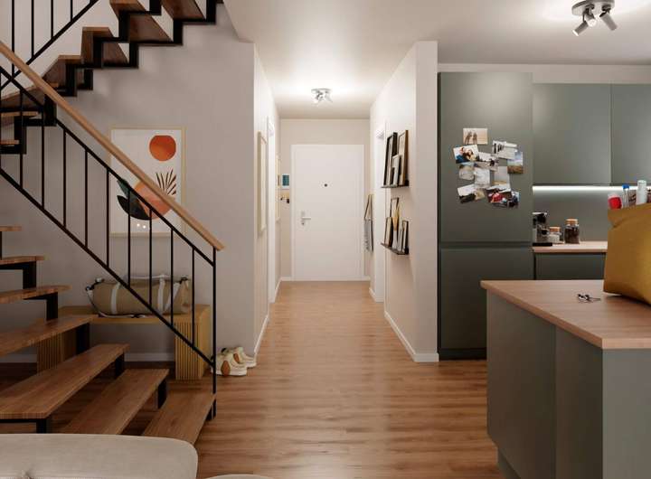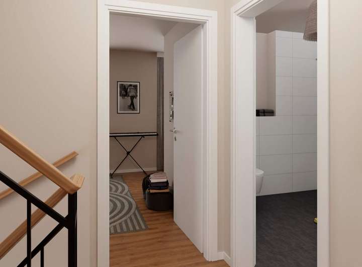 Im Erdgeschoss erwartet Sie ein großzügiger Wohnbereich, der zum Entspannen einlädt. Die offene Wohnküche mit Terrasse, die direkt in den eigenen Garten führt, bietet Raum für kulinarische Abenteuer und gesellige Abende. Zudem befindet sich auf dieser Ebene ein praktisches Gäste-Bad. Im Obergeschoss erwarten Sie zwei großzügige Schlafzimmer, eines davon mit begehbarem Kleiderschrank. Für beide Zimmer steht ein hochwertiges Bad mit Dusche und Badewanne zur Verfügung. Das vielseitig nutzbare Studio im Dachgeschoss öffnet sich direkt zur sonnigen, nach Südwesten ausgerichteten Dachterrasse – der ideale Ort, um den Nachmittag entspannt zu genießen. Das Haus bietet insgesamt fünf Zimmer und zwei Bäder – perfekt, um Ihrer Familie Komfort, Freiraum und Wohnqualität auf höchstem Niveau zu bieten.