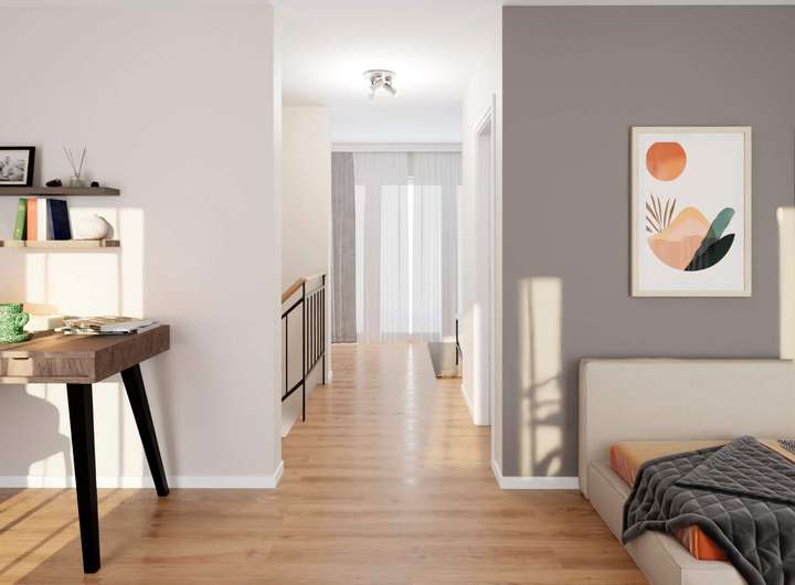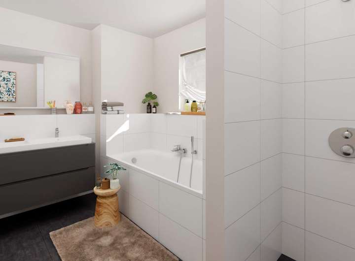 Im Erdgeschoss erwartet Sie ein großzügiger Wohnbereich, der zum Entspannen einlädt. Die offene Wohnküche mit Terrasse, die direkt in den eigenen Garten führt, bietet Raum für kulinarische Abenteuer und gesellige Abende. Zudem befindet sich auf dieser Ebene ein praktisches Gäste-Bad. Im Obergeschoss erwarten Sie zwei großzügige Schlafzimmer, eines davon mit begehbarem Kleiderschrank. Für beide Zimmer steht ein hochwertiges Bad mit Dusche und Badewanne zur Verfügung. Das vielseitig nutzbare Studio mit einem weiteren Gäste-Bad im Dachgeschoss öffnet sich direkt zur sonnigen, nach Süden ausgerichteten Dachterrasse – der ideale Ort, um den Nachmittag entspannt zu genießen. Das Haus bietet insgesamt fünf Zimmer und drei Bäder – perfekt, um Ihrer Familie Komfort, Freiraum und Wohnqualität auf höchstem Niveau zu bieten.