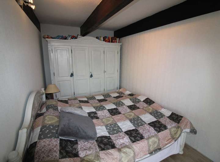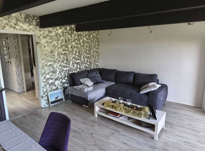 Besonders charmant sind die sichtbaren Deckenbalken, die dem Raum ein warmes und gemütliches Ambiente verleihen.