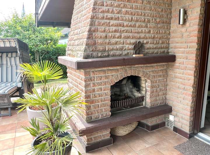Die Wohnung im Erdgeschoss besticht durch eine durchdachte Raumaufteilung und helle, freundliche Wohnräume. Sie umfasst eine funktionale Küche, ein modernes Tageslichtbad mit Wanne und Dusche sowie ein gemütliches Schlafzimmer mit Blick in den seitlich gelegenen Garten. Das Herzstück der Wohnung bildet das großzügige Wohn- und Esszimmer mit bodentiefen Fensterfronten zur Terrasse und einem stilvollen Kamin. Die überdachte Südterrasse mit Außenkamin lädt zu entspannten Stunden im Freien ein und führt direkt in den wunderschön angelegten Garten mit derzeit stillgelegter Teichanlage, altem Kirschbaum und vielen liebevollen Details. Einen rückwärtigen Zugang zur Garage finden Sie neben dem Haus.