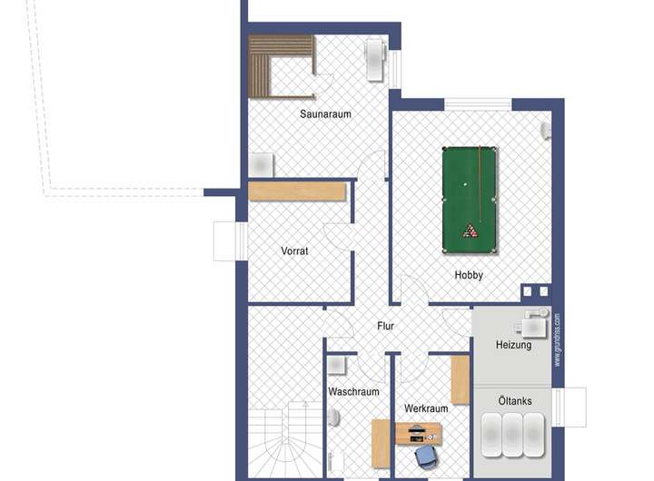Das Haus ist voll unterkellert und bietet eine Vielzahl an zusätzlichen Nutzungsmöglichkeiten. Neben einem Vorratsraum, dem Heizungskeller, einer Waschküche und einem Werkraum stehen zwei großzügige, tagesbelichtete Räume zur Verfügung: ein großer Hobbyraum mit Wasseranschluss und ein Wellnessbereich mit Sauna und Dusche und ebenfalls viel Tageslicht – ideal zum Relaxen. Diese Flächen sind nicht in der angegebenen Wohnfläche enthalten.