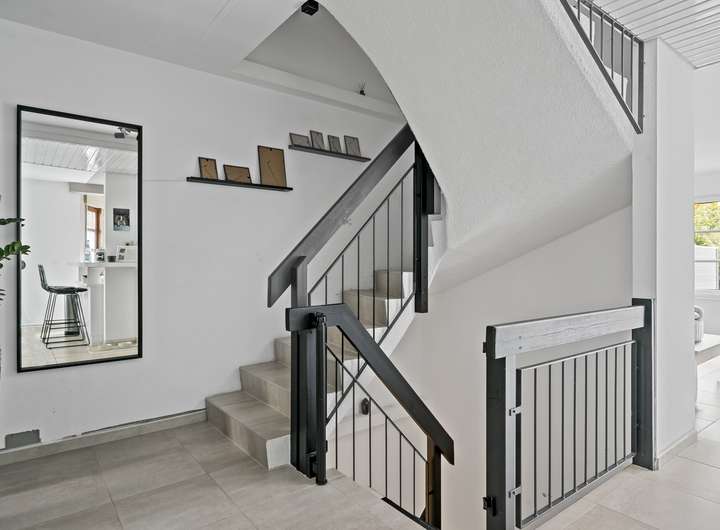 Im Erdgeschoss befindet sich ein Windfang, ein Gäste-WC, der Essbereich mit offener Küche, der Flur/das Treppenhaus und das großzügige und helle Wohnzimmer mit Zugang in den Garten.