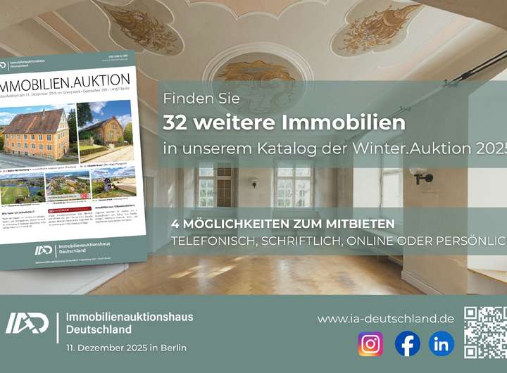 Die 4 Möglichkeiten zum MITBIETEN finden Sie im Katalog, auf unser Homepage (www.ia-deutschland.de) sowie im Datenraum des Exposes (Gebotsformular). Für weitere Fragen stehen wir unter 030-2000 34 690 oder per E-Mail an info@ia-deutschland.de zur Verfügung.