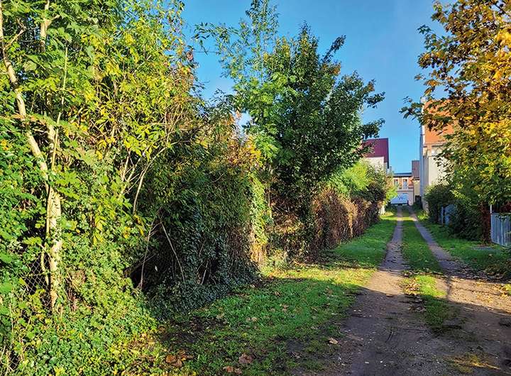 Das Grundstück befindet sich neben einem Parkplatzareal „An der Spiellücke“ und grenzt an Wohnbebauung mit Gärten.
