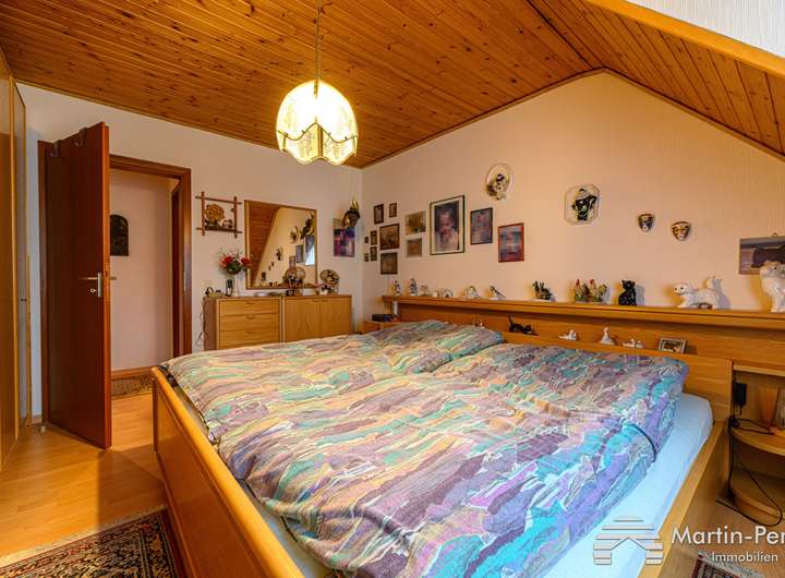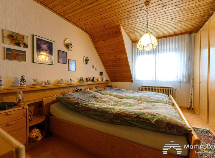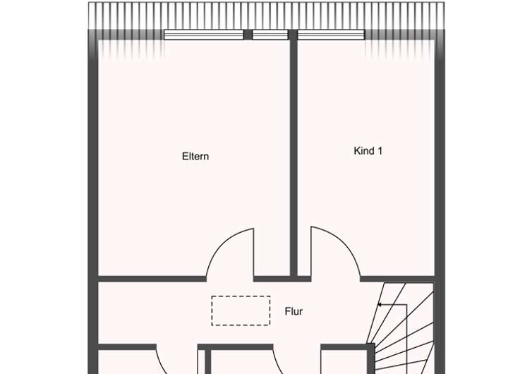 Dachgeschoss: Drei (Schlaf-)Räume, Flur, Badezimmer, ausgestattet mit Dusche, Badewanne, Waschbecken, WC, Fenster. Von einem der Schlafräume aus erfolgt der Zugang zum Spitzboden, der reichlich Stauraum bietet.