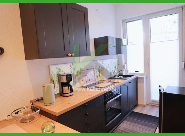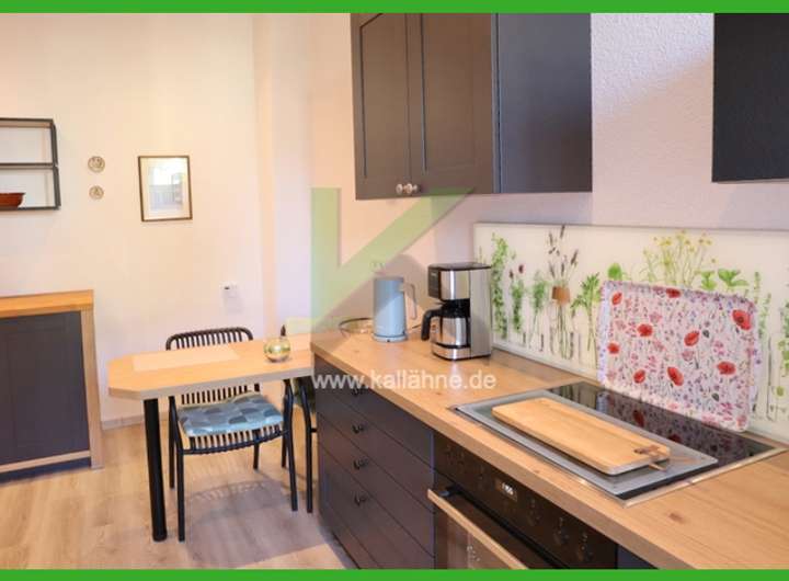 Die moderne Einbauküche ist vollständig ausgestattet und lässt keine Wünsche offen. Von hier aus gelangen Sie auf den kleinen Balkon, der zum Frühstücken oder Entspannen im Freien einlädt.