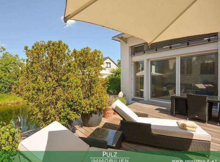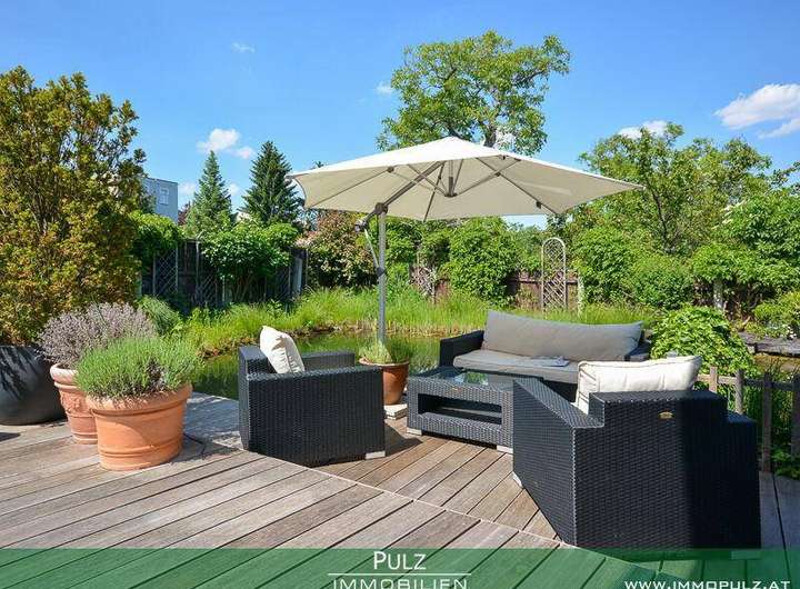• traumhafte Holzdeck-Terrasse (ca. 60 m2) mit Loungebereich direkt am Biotop