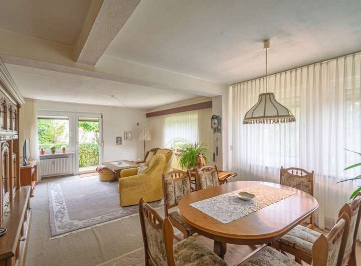 EG: großes Wohnzimmer mit Essbereich ca. 35 m² und Ausgang zur Gartenterrasse, sowie zwei weitere Zimmer, GWC und Bad mit Fenster