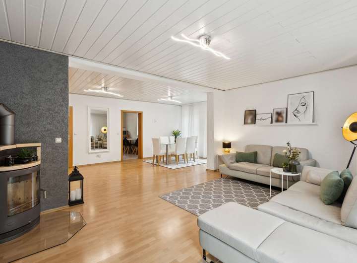 Im Erdgeschoss erwartet Sie ein großzügiger Wohn- und Essbereich mit Kamin, der an kühlen Tagen eine wohlige Atmosphäre schafft. Große Fensterflächen lassen viel Licht herein und bieten einen herrlichen Blick in den gepflegten Garten – ideal zum Entspannen, Spielen oder geselligen Beisammensein im Sommer.