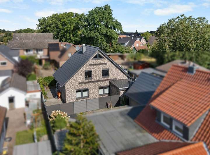 Dieses im Jahr 2020 erbaute Zweifamilienhaus in Ganderkesee vereint moderne Architektur mit zeitlosem Landhaus-Charme. Die Klinkerfassade und das elegante Balkendesign schaffen ein einladendes Erscheinungsbild, während die hochwertige Ausstattung im Inneren für ein komfortables Wohngefühl sorgt.