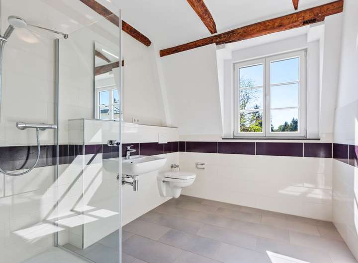 Besondere Akzente setzen kunstvoll geschmiedete Brüstungsgitter, freigelegte Holzbalken sowie die imposanten Deckenhöhen – ergänzt durch moderne, dezente Designelemente, die sich harmonisch ins historische Gesamtbild einfügen.