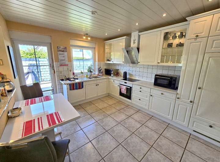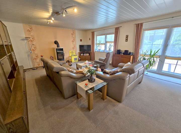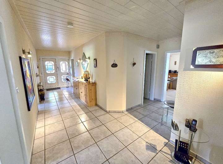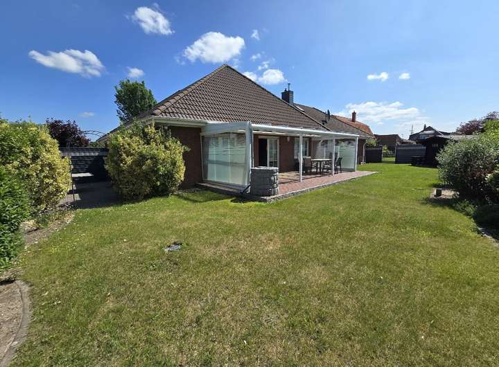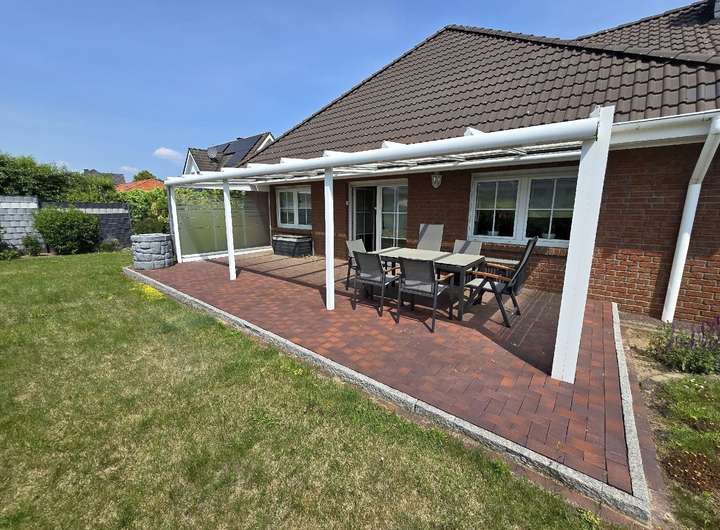 Dieser hochwertig gebaute Bungalow aus dem Jahr 1996 besticht durch seine massive Bauweise, eine großzügige Wohnfläche von rund 151 Quadratmetern sowie einen sehr gepflegten, nahezu neuwertigen Zustand. Der offen gestaltete Wohn-, Ess- und Kochbereich schafft ein helles und freundliches Wohnambiente mit direktem Zugang zur überdachten Terrasse, die zum Entspannen im Freien einlädt – auch bei wechselhaftem Wetter. Ein besonderes Detail: Auch die Küche bietet Zugang zu einer weiteren, separaten Terrasse, die sich ideal für das Frühstück im Freien oder gemütlichen Kaffeepausen eignet. Die Immobilie verfügt über drei gut geschnittene Schlafzimmer und bietet damit ausreichend Platz für Familien, Paare mit Platzbedarf oder Gäste. Der liebevoll angelegte Garten ist mit einem automatisierten Bewässerungssystem ausgestattet und pflegeleicht gestaltet. Teilweise elektrisch betriebene Rollläden sorgen für zusätzlichen Komfort und Sicherheit. Im Dachgeschoss befindet sich eine Ausbaureserve mit viel Potenzial für zusätzlichen Wohnraum, ein Büro oder Hobbybereich. Eine großzügige Garage mit direktem Zugang zum Garten und reichlich Stauraum rundet dieses attraktive Angebot ab. Dieser Bungalow eignet sich ideal für alle, die komfortables Wohnen auf einer Ebene schätzen und zugleich Raum für individuelle Gestaltungsmöglichkeiten suchen.