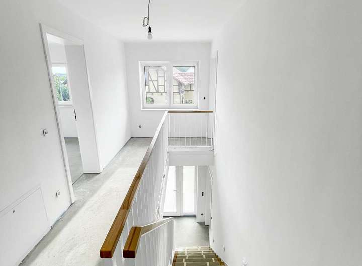 Im Obergeschoss erwarten Sie helle Schlafzimmer und ein elegantes Badezimmer mit hochwertigen Armaturen. Die moderne Haustechnik sorgt dabei jederzeit für Komfort und Effizienz.